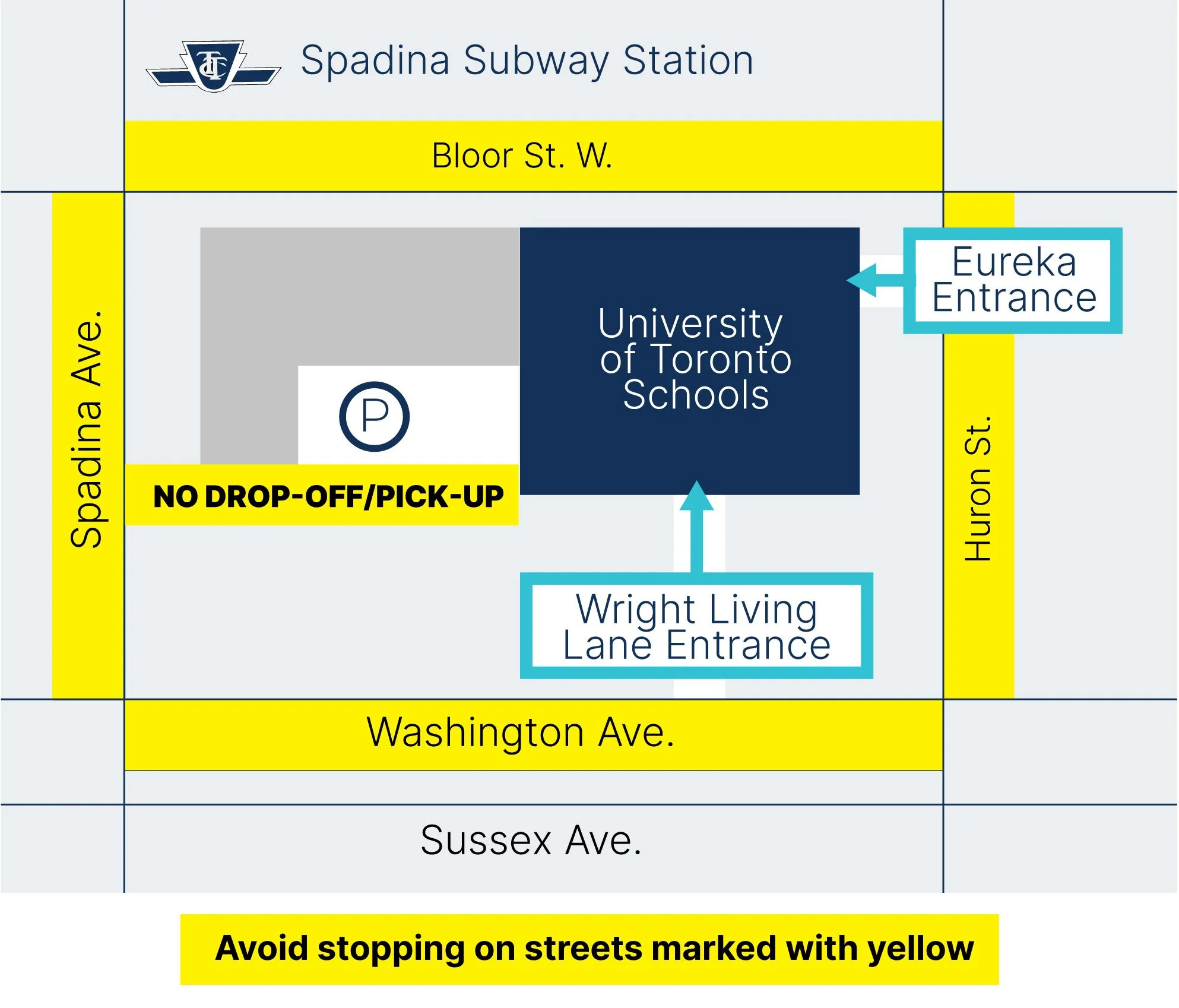 The Eureka! Entrance on Huron St. and the entrance on Bloor St. W. are not for entry for parents and guardians. Once you enter the school, please sign in with security and get a visitor’s badge. Don’t forget to sign out and return the badge when you leave.